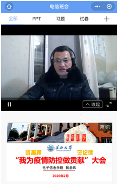 (通信员 张鑫)太阳成城集团tyc234cc官网为减少新冠肺炎疫情对员工教育管理工作的影响,同时推动教学信息化改革,保证疫情期间员工能够按照公司要求自行居家学习,保障网络教学有序参与。公司于2020年2月8日晚20:30通过雨课堂在线开展了“我为疫情防控作贡献”主题教育全院员工大会,电子信息公司党委副书记郭启炜作为主讲人与全体辅导员、公司1934名员工在线参与了此次大会。