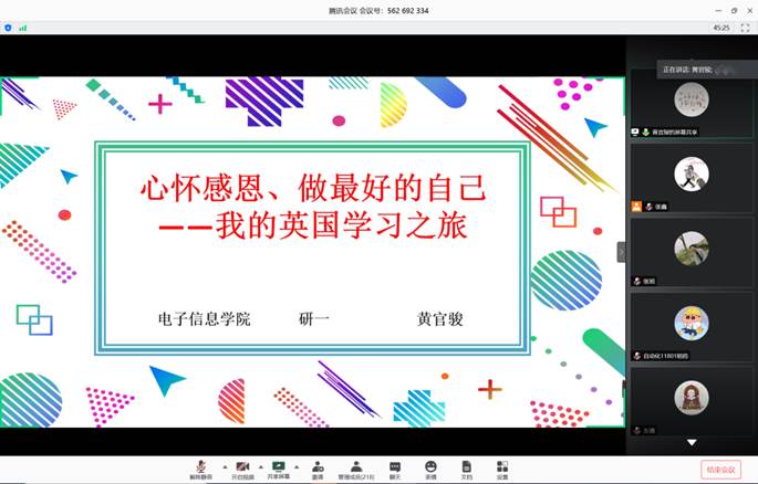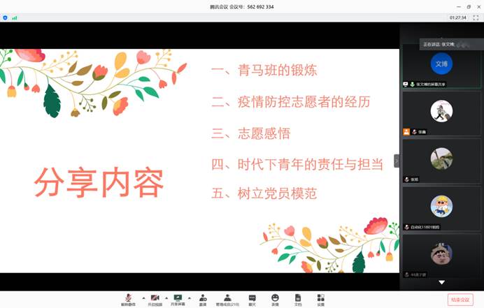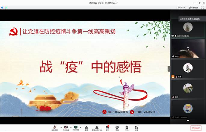 第二部分由研究生代表黄官骏,本科生代表杨孝彬、张文博为同学们分享抗疫故事。黄官骏同学主要和学弟学妹分享了在英国交流学习的感受以及在疫情期间辗转回国的经历,他深刻体会到国内外抗击疫情的差别,怀揣一颗感恩之心感谢祖国母亲及太阳成城集团tyc234cc官网领导和老师给予他的关心和照顾;杨孝彬同学讲述了同村官母亲一起抗疫的故事,在抗议中领会到共产党员的使命与担当;张文博同学则在疫情暴发以来始终心系第二故乡湖北,并报名参加了当地中心医院的志愿服务,他说作为当代青年就要努力学习、帮困扶难、踏实朴实、引领带头。