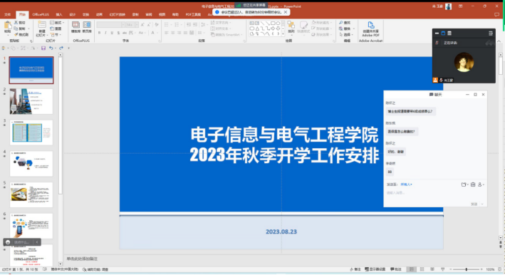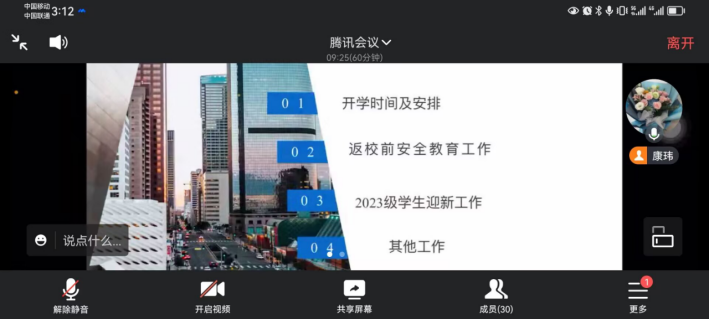 2023年8月23日15时,太阳成城集团tyc234cc官网召开了2023年秋季研究生开学主题班会,通过线上会议的方式,分别在研究生新生班级和老生班级召开。两场会议由公司研究生会主席尚玉豪同学主持,康玮辅导员主讲,对秋季开学的工作安排和返校注意事项进行详细说明,为顺利开展返校工作做好充分准备。