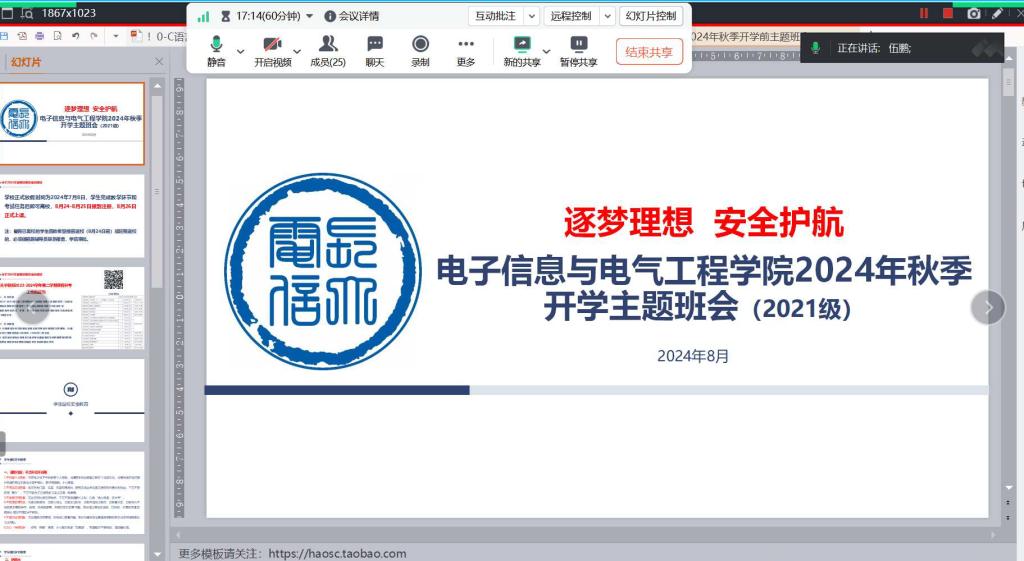 本次班会主要围绕以下四个方面开展:一是针对老生传达新学期公司产品事项,包括返校时间安排以及学费缴纳等;二是返校前安全教育;三是开展网络文明建设教育;四是针对2024级新生,讲解线上报到流程及注意事项等内容。