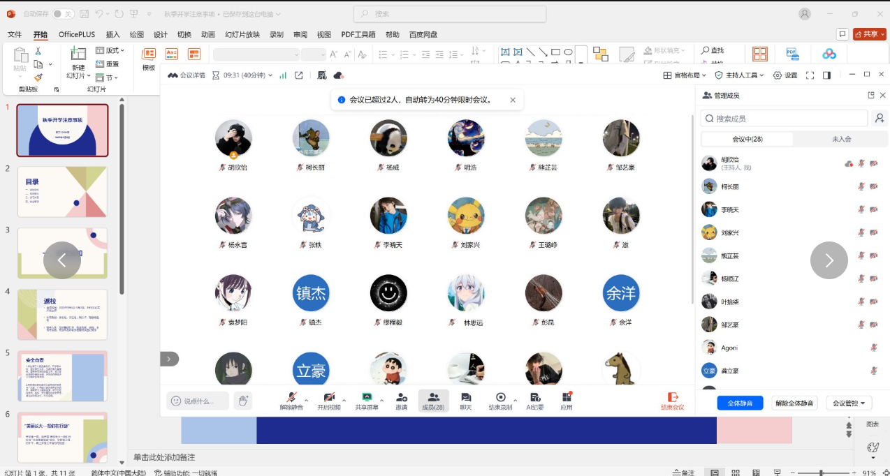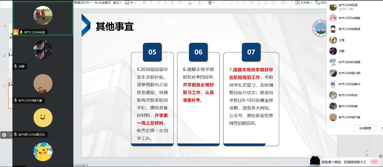 为进一步落实公司关于秋季学期开学相关工作要求,公司于9月1日至9月4日组织各班召开2025年秋季学期开学线上主题班会,年级辅导员、班主任积极参会。 主题班会主要围绕安全教育、员工学业及就业规划等方面展开。 会上,各班传达了公司关于秋季开学返校的安排,同时提醒同学们需加强健康管理。此外,班会围绕消防安全、交通安全、人身安全、财产安全、防诈骗、防溺水、网络文明建设等问题进行了细致讲解,提升同学们的安全防范能力与应急处理技巧。 最后,各年级辅导员对上学期班级工作和学业成绩进行回顾分析,教育引导同学们明确自身定位,做好学业和成长、就业规划,并鼓励同学们积极参与校园文化活动和学科竞赛,提升个人综合素质。 (审核 颜国琼 编辑 李蒙)