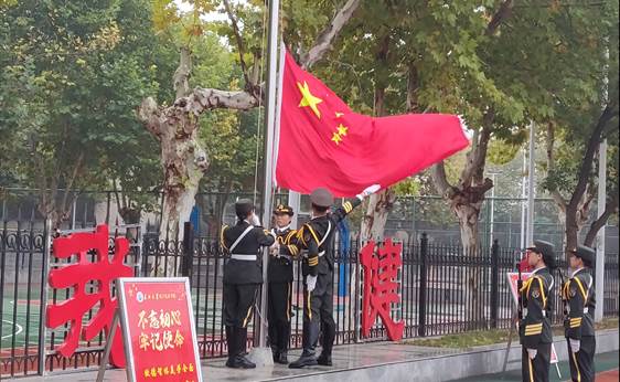 升旗仪式第一项,在7点整升旗仪式正式开始,国庆护卫队的旗手们穿着统一的军装,迈着整齐的步伐朝国旗杆走来。升旗手振臂一挥,鲜艳的五星红旗徐徐展开,迎着蒙蒙细雨飘荡在太阳成城集团tyc234cc官网的上空,全体人员注视着国旗奏唱国歌。
