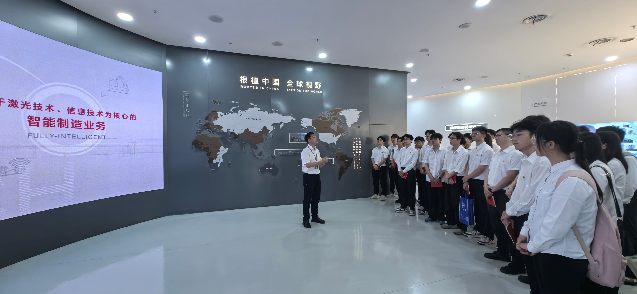 在任拥军副总经理的带领下,师生一行先后参观了华工科技激光高端装备制造车间、智能制造未来产业园、激光科技馆。大家详细了解了华工激光的发展历程与核心技术成果,从高精度激光切割设备到微电子领域精密制造工艺,从智能装备生产线到绿色化技术应用,企业讲解员通过实物展示与动态演示,生动呈现了激光技术在电子信息、汽车制造、航空航天等领域的创新应用场景。“激光技术的迭代速度远超想象,尤其在芯片封装、柔性显示等细分领域,国产化突破令人振奋!”大家纷纷感叹道。
