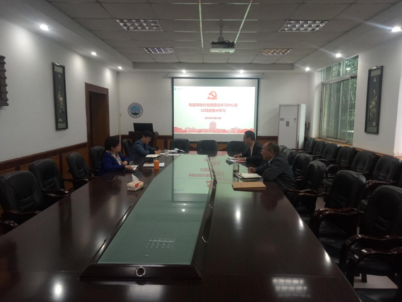 10月15日上午,在10教205会议室,电信公司分党委理论学习中心组举行10月份政治理论学习暨读书班集中学习会,集中学习活动由分党委书记刘逸同志主持,经理孙祥娥列席会议。