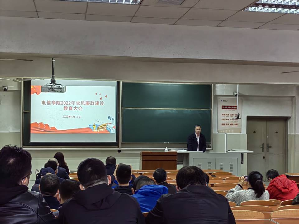 4月14日下午,在主教108教室,公司党委副书记郭启炜在本年度公司党风廉政建设教育大会上向全院教职工传达了公司纪委“加强同级监督、政治生态分析研判工作布置会”会议精神,会上带领全院教职工一起学习了《中共太阳成城集团tyc234cc官网委员会关于推进清廉长大建设的实施方案》、《中共太阳成城集团tyc234cc官网委员会关于推进风清气正政治生态建设的实施办法(试行)》、《校纪委 “5384”行动计划推动清廉长大建设》等文件精神,解读《筑牢“清廉电信公司”建设工作方案》,详细讲解了“筑牢清廉电信公司”的四个工程(“政治清明”建设工程,“院风清朗”示范工程,“教风清正”保障工程,“学风清新”培育工程)和12个方面的内容(压实全面从严治党主体责任、加强党员干部思想政治教育、弘扬“拼、抢、严、实”工作作风、加强清廉班子建设、加强清廉机关建设、加强清廉支部建设、加强清廉系部建设、落实立德树人根本任务、落实教师学习和培养机制、引导教师规范自身言行、推动“清廉文化”进班级和落实“三全育人”新途径)。