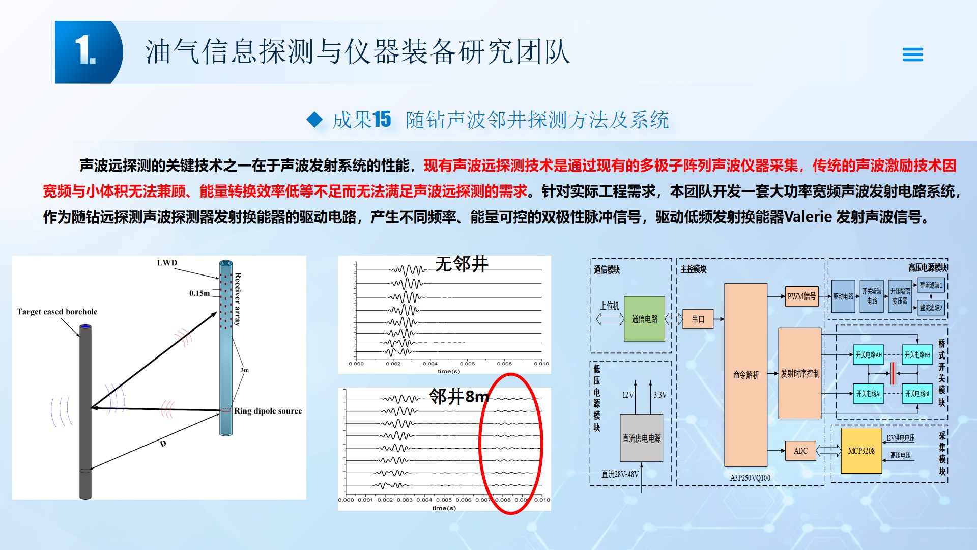 围绕声、电探测关键技术(传感器、声传播理论、仪器装备、数据处理及解释等),团队成员主持国家自然科学基金4项、湖北省自然科学基金6项、中石油创新基金4项及横向课题100余项。在《中国科学:地球科学》、《 Journal of petroleum science and engineering 》等石油领域权威学术期刊发表论文200多篇,出版专著4部,授权专利20余项;获省部级科技进步奖5项。团队开展了全频段、多尺度声波传感器及声学探测方法研究,并将相关技术整合研发了系列装备,以随钻井径测量系统、随钻数据压缩系统、远探测信号激励系统、多功能井下信号格式转换短节、便携式电火花震源、气枪控制系统为代表的成果已在油田现场取得了良好的应用效果。